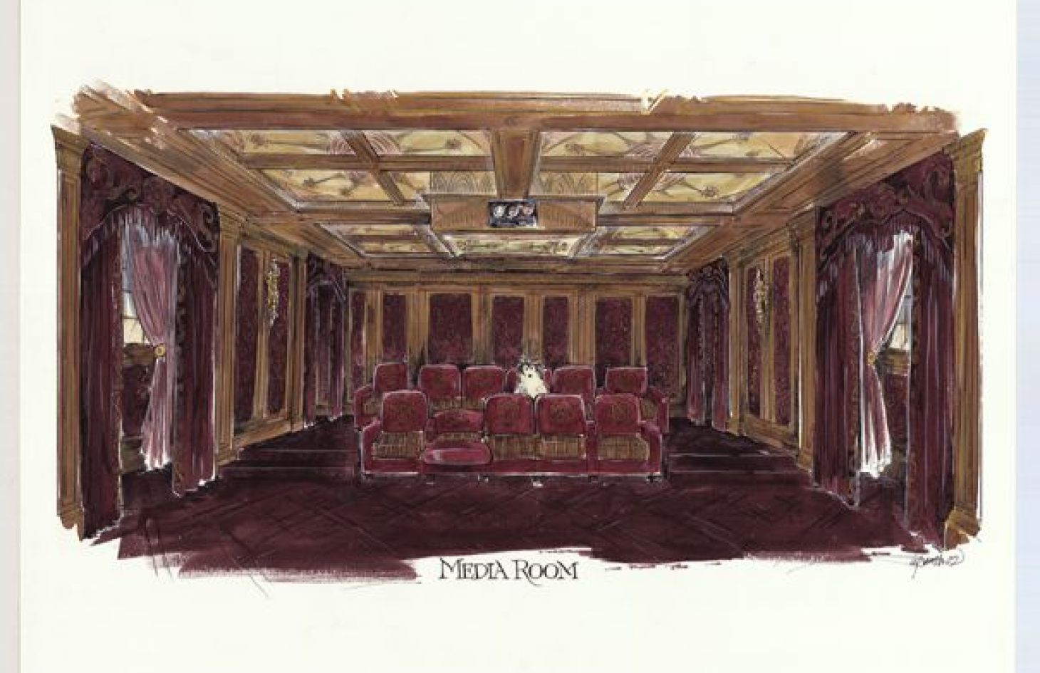 We collaborated with the engineers at California Audio Technologies to design the speaker layout, seating arrangement, and acoustics for the room. To achieve a high-performance space, we incorporated heavy curtains and other thematic elements. If most home theaters are akin to Boeing 737s, this one would be an F-16—built for pure precision and power. Every detail was meticulously planned. We enlisted a lighting designer to perfect the illumination, and the interior designer created Parisian-style sketches of the room and seating layout. The ceiling was even adorned with hand-applied gold leaf to bring the opera house aesthetic to life. A custom bronze door, mounted on bank vault hinges, was installed and then burnished in place, adding another layer of craftsmanship.